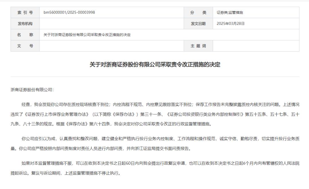 经查明,浙商证券存在质控现场核查不到位;内控流程不规范、内控意见跟踪落实不到位;保荐工作报告未完整披露质控内核关注问题等情况。基于此,证监会决定浙商证券采取责令改正的行政监督管理措施。