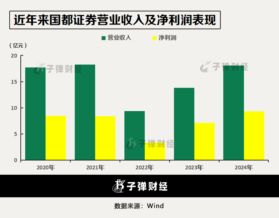 2021年,国都证券营收一度超过18亿元,2022年骤降至9.38亿元,2023年靠自营业务营收回升至13.81亿元,2024年其营业收入18.05亿元,同比增长约31%,净利润与营业收入走势几乎一致。