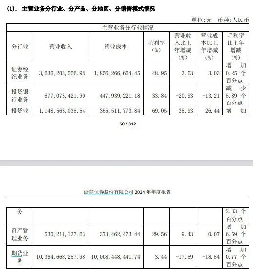 投资银行业务方面,2024年,浙商证券投资银行业务实现收入6.77亿元,同比下降20.93%;毛利率达33.84%,同比减少5.89个百分点。