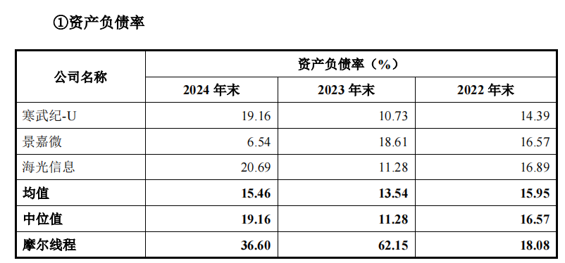 不过,多项费用的叠加,以及未盈利依然导致摩尔线程的经营性现金流始终为负。2022-2024年,经营活动现金流净额分别为-14.35亿元、-11.29亿元、-18.28亿元,三年累计净流出43.9亿元。截至2024年12月31日,摩尔线程的流动负债达20.08亿元,其中短期借款为9.18亿元,主要为银行借款,用于公司短期营运资金需求。2022年-2024年,摩尔线程的资产负债率分别为18.08%、62.15%和36.6%。这远高于同行均值,同期,同行业均值分别为15.95%、13.54%和15.46%。