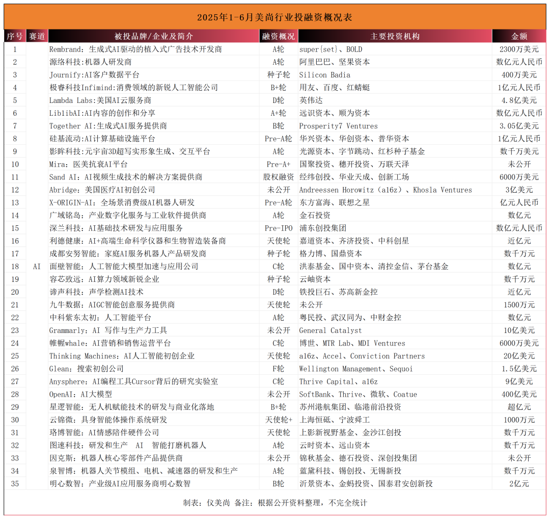 其中,美妆领域(含护肤/彩妆/原料商等)的投融资事件达到73起,融资总额超260亿元;新消费领域63起,融资总额88.7亿元。而AI领域仅纳入统计的35个项目,融资额便高达3284亿元,堪称是上半年的最强“吸金兽”。