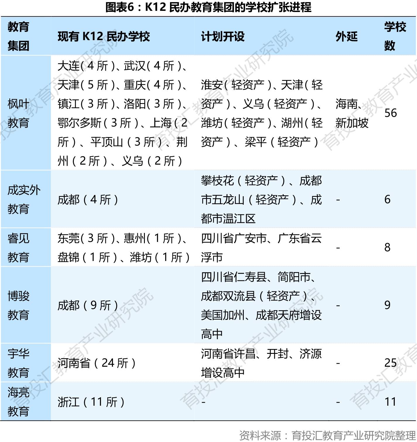 从现有学校布局来看,枫叶教育的学校主要分布在华东、华中、华北及东北等地区,实现了“全国范围遍地开花”;而其他5家公司的学校都只是“一方霸主”,如成实外教育布局以成都为核心的西南地区,宇华教育布局以河南为核心的华中地区,睿见教育则是布局以广东为核心的华南地区,海亮教育布局以浙江为核心的长三角地区。