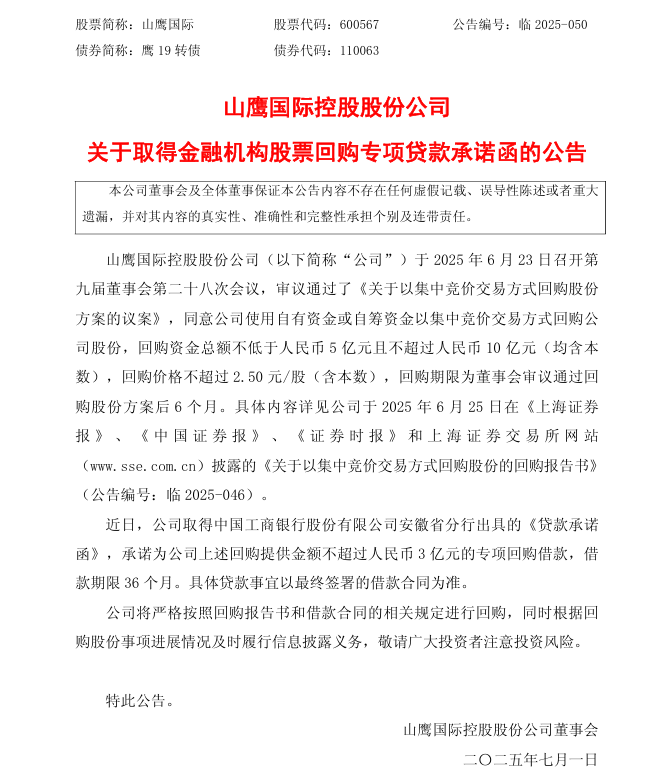 据公告,近日,山鹰国际已取得中国工商银行股份有限公司安徽省分行出具的《贷款承诺函》,承诺为山鹰国际回购提供金额不超过3亿元的专项回购借款,借款期限36个月。