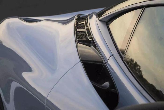 而说到违和的地方,首先是“熊猫眼”。当你第一眼看到720S时,相信大家的感受和我一样,认为前大灯怎么这么违和。迈凯伦在车辆资料里写到这样的设计,上半部分是车灯,而下半部分则是空气流通通道,这样的设计不仅减少了车头的乱流,这些被“理顺”之后的空气会被分配配到制动系统用于冷却,被分配至车身用于增加下压力,以及为发动机提供燃烧介质。