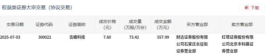 7月3日,吉峰科技大宗交易成交73.42万股,成交额557.99万元,占当日总成交额的2.54%,成交价7.6元,较市场收盘价9.58元折价20.67%。