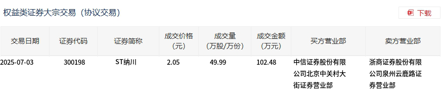 7月3日,ST纳川大宗交易成交49.99万股,成交额102.48万元,占当日总成交额的1.62%,成交价2.05元,较市场收盘价2.51元折价18.33%。