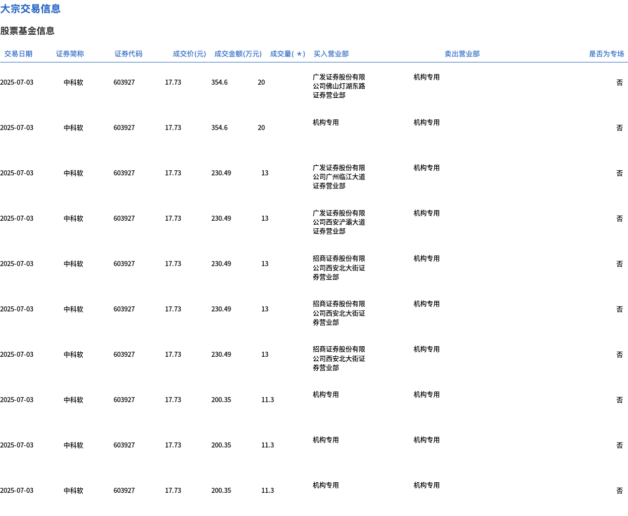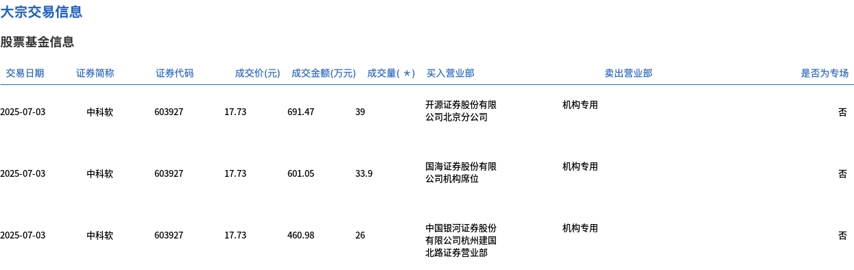 7月3日,中科软大宗交易成交237.8万股,成交额4216.2万元,占当日总成交额的5.65%,成交价17.73元,较市场收盘价20.28元折价12.57%。