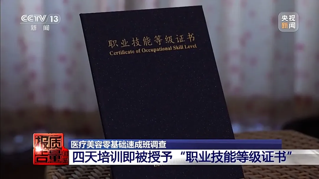 根据央视报道,证书里的“中国医美科学管理培训中心”并未在全国社会组织信用信息公示平台、国家企业信用信息公示系统里查到,致电12333后发现,行业也不存在“高级轻医美科技抗衰技术管理师”的相关认定。