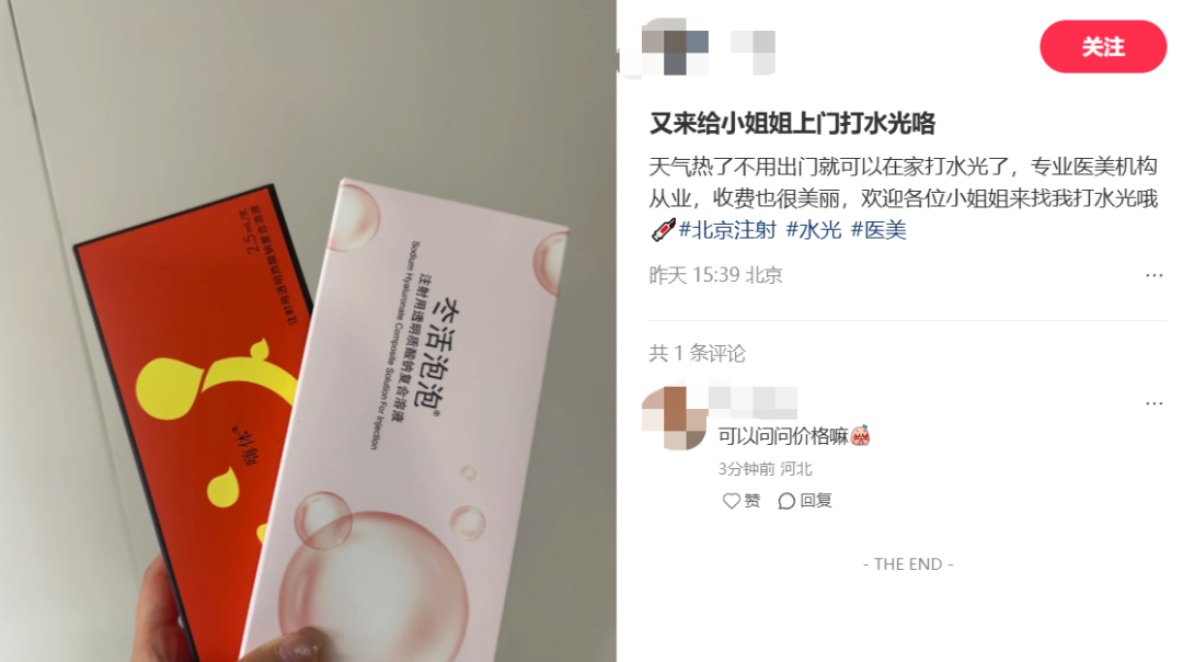 巨大的人才缺口,让这些非法培训机构和其学员看到了“商机”。“趣解商业”注意到,社媒平台上有不少所谓的“私人美容师”,会用上门服务的帖子或视频来吸引用户,其提供的服务包括微针、水光针等医美项目。