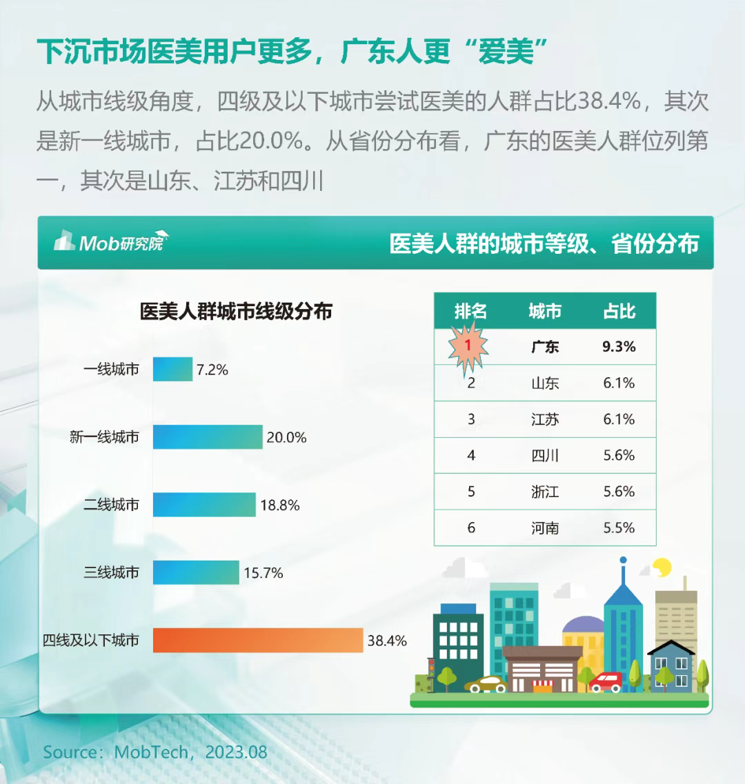 本就稀少的医美医生,还大多集中在一二线城市。根据“新氧数据颜究院”数据,中国前十大城市医美医生数量超过全国的50%。然而低线城市医美消费的热情并不低,MobTech数据显示,2023年四级及以下城市尝试医美的人群占比最高,为38.4%,远高于一线城市。这也意味着,下沉市场的消费者想找到靠谱的医生,难上加难。