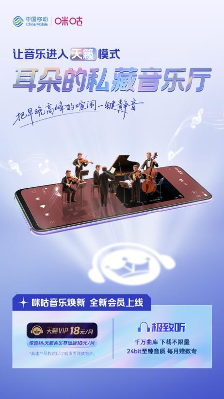 作为最受用户喜爱的宝藏音乐平台之一,咪咕音乐一直致力于为用户提供更高品质的音乐体验。此次推出全新会员“天籁”,不仅是会员体系的一次重磅升级,也是咪咕音乐产品生态重构、品牌持续焕新的重要信号。通过全面焕新,咪咕音乐不断做大生态,构建国内领先流媒体音乐体验和发行平台,以用户使用体验为中心,为广大音乐会员打造更加专业极致和个性化的音乐服务。耳朵已就绪,行动正当时,立即打开咪咕音乐APP,抢先体验天籁VIP,让美好的音乐成为你随时在线的好友吧。