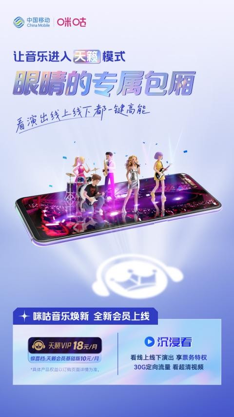 音乐,不止于听。咪咕音乐天籁VIP“沉浸看”尊享购票特权,无论云端直播还是现场狂欢,不错过每一次心跳。再加上专属 30G定向流量的保驾护航,视听盛宴更是流畅无阻,感官体验全面沉浸。