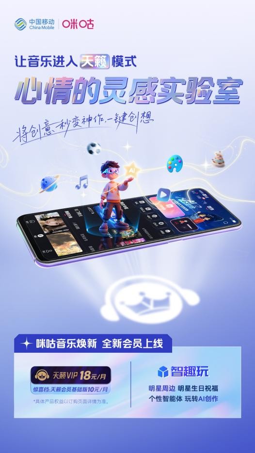 追星新姿势持续解锁中,咪咕音乐天籁VIP“智趣玩”助你获取限定明星周边福利,参与独家明星AI互动,打破次元壁,与偶像开启全新对话。生日当天还能收获偶像独家12530明星生日祝福,独宠仪式感拉满。更有个性智能体功能等你探索,玩转AI音乐创作,激发灵感,真正成为音乐世界的造梦者。