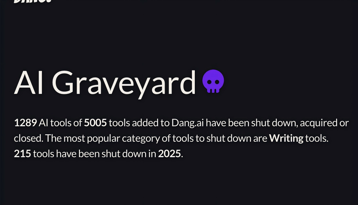 但他没说的是,每一个领域涌现出新的当红辣子鸡,每一轮融资和用户注意力争夺背后,有一大批的AI创业项目正在「消失」。根据AI工具聚合网站「DANG!」创建的AI Graveyard(AI墓地)数据,截至目前,在其收录超5000个AI项目中,有1289个已被关闭、被收购或关闭。