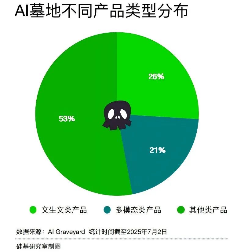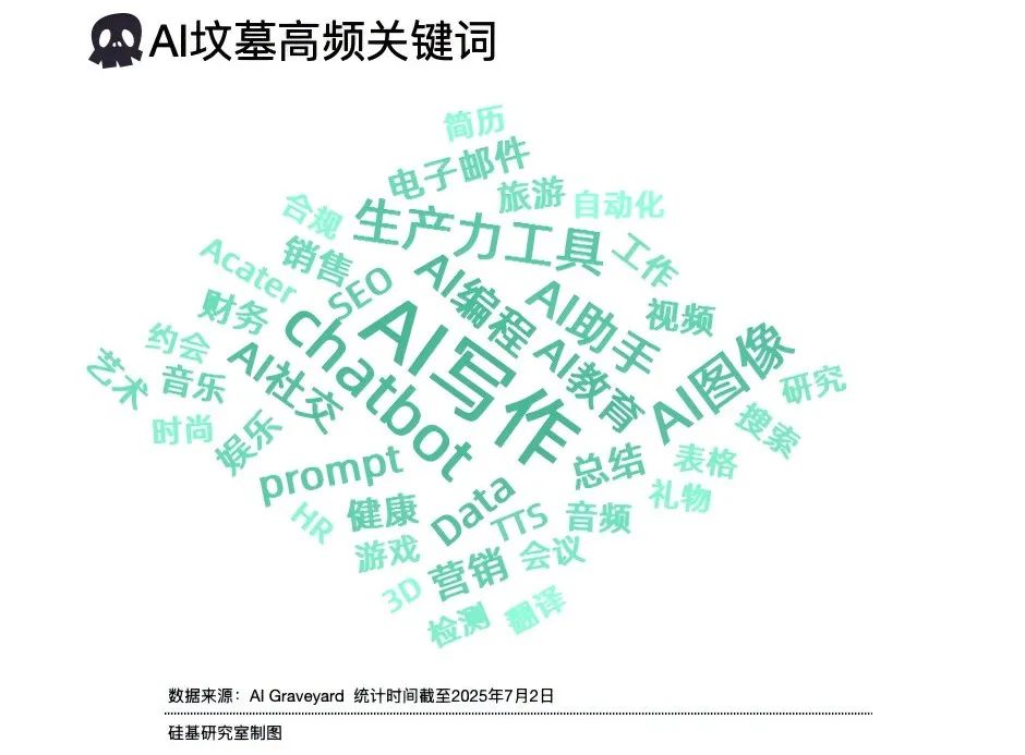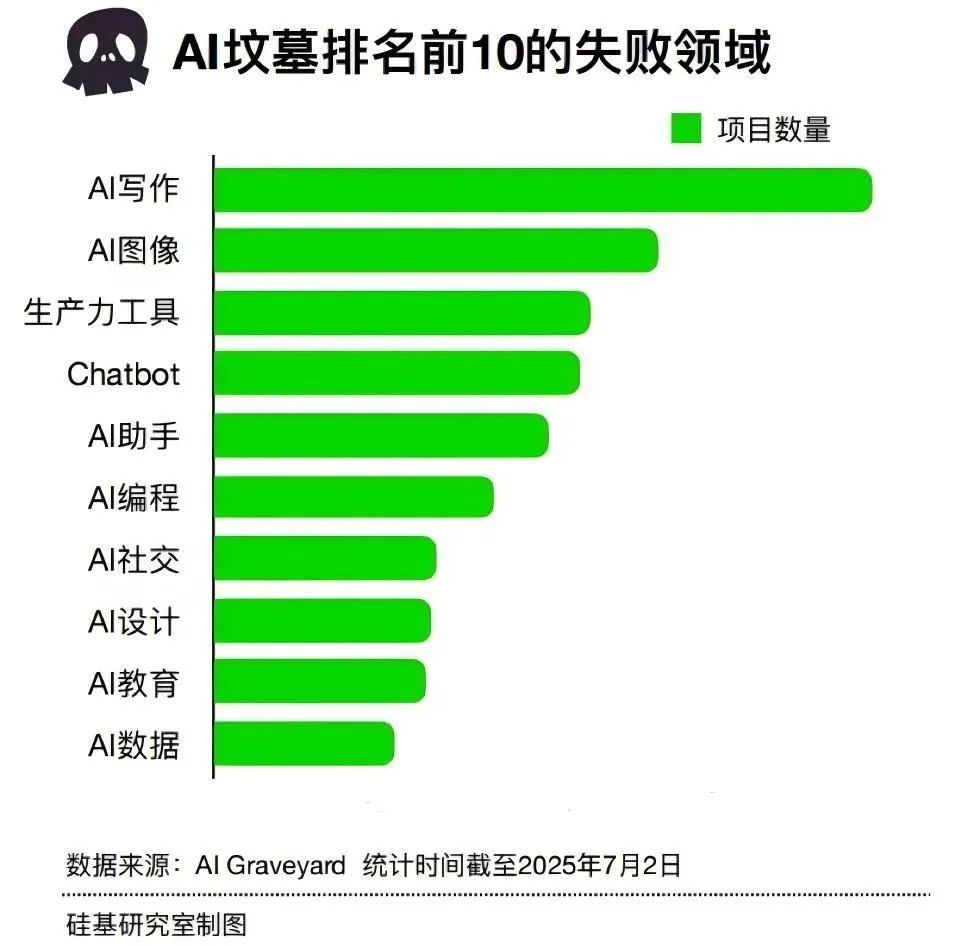 据AI Graveyard的数据,仅2025年上半年,就有超200个工具被关闭,平均一天就有1家AI项目走向「坟墓」。