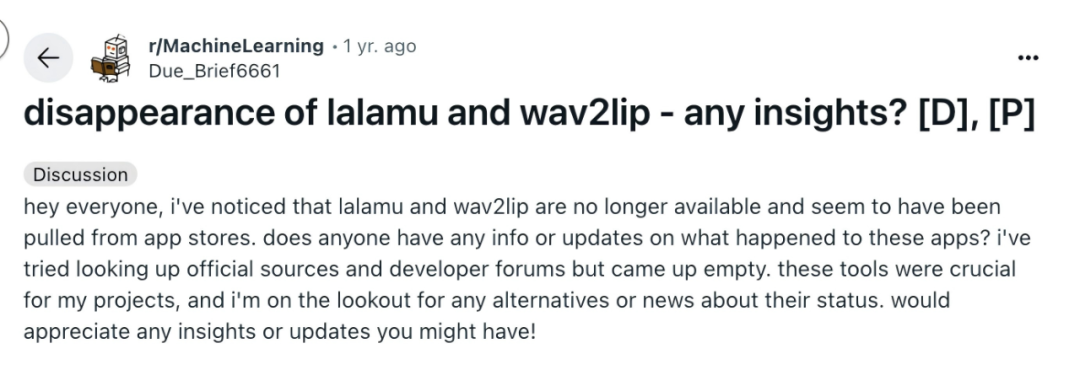 一年前,Reddit上,有开发者曾发布这样的帖子:“我注意到lalamu和wav2lip已经下架了,请问有人知道这些应用发生了什么吗?我尝试查找官方资源和开发者论坛,但都一无所获,这些工具对我的项目至关重要......”。