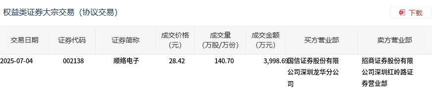 7月4日,顺络电子大宗交易成交140.7万股,成交额3998.69万元,占当日总成交额的10.25%,成交价28.42元,较市场收盘价28.42元持平。