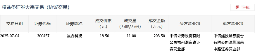 7月4日,赢合科技大宗交易成交11万股,成交额203.5万元,占当日总成交额的0.36%,成交价18.5元,较市场收盘价20.99元折价11.86%。