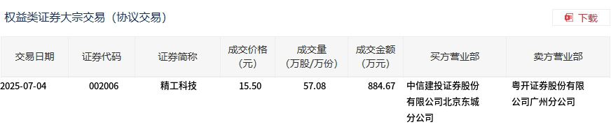 7月4日,精工科技大宗交易成交57.08万股,成交额884.67万元,占当日总成交额的4.48%,成交价15.5元,较市场收盘价15.74元折价1.52%。
