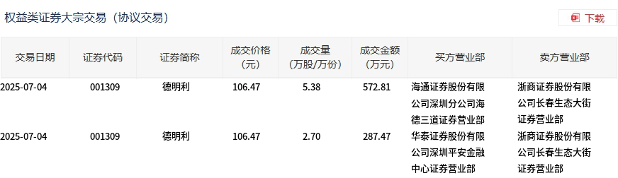7月4日,德明利大宗交易成交8.08万股,成交额860.28万元,占当日总成交额的0.91%,成交价106.47元,较市场收盘价121.38元折价12.28%。