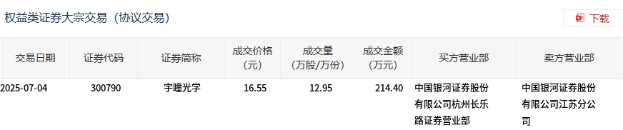 7月4日,宇瞳光学大宗交易成交12.95万股,成交额214.4万元,占当日总成交额的1.25%,成交价16.55元,较市场收盘价19.96元折价17.08%。