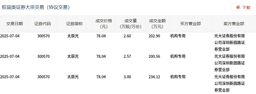 7月4日,太辰光大宗交易成交8.17万股,成交额637.58万元,占当日总成交额的0.4%,成交价78.04元,较市场收盘价88.68元折价12%。