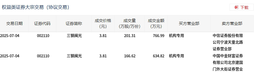7月4日,三钢闽光大宗交易成交367.93万股,成交额1401.81万元,占当日总成交额的5.76%,成交价3.81元,较市场收盘价3.81元持平。
