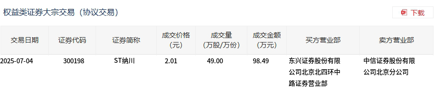 7月4日,ST纳川大宗交易成交49万股,成交额98.49万元,占当日总成交额的2.23%,成交价2.01元,较市场收盘价2.5元折价19.6%。