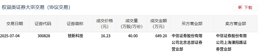 7月4日,锐新科技大宗交易成交40万股,成交额649.2万元,占当日总成交额的6.56%,成交价16.23元,较市场收盘价16.43元折价1.22%。