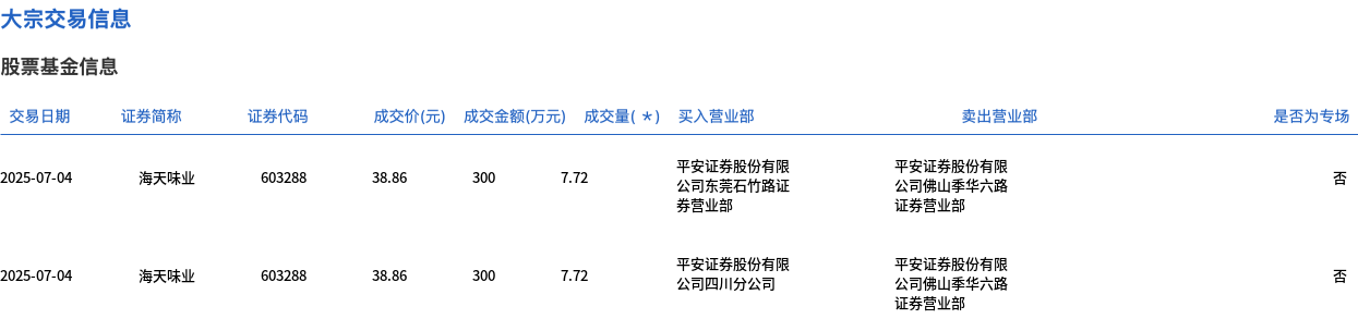 7月4日,海天味业大宗交易成交15.44万股,成交额600万元,占当日总成交额的1.5%,成交价38.86元,较市场收盘价38.86元持平。
