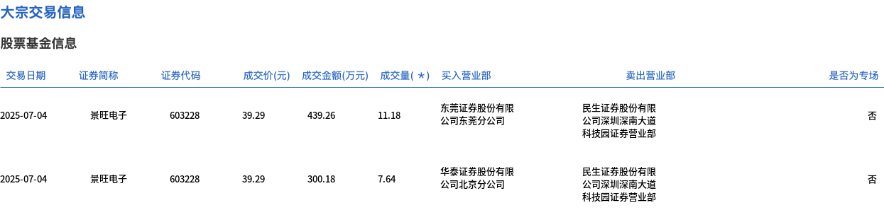 7月4日,景旺电子大宗交易成交18.82万股,成交额739.44万元,占当日总成交额的0.27%,成交价39.29元,较市场收盘价46.58元折价15.65%。