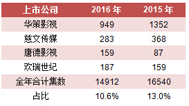 虽然收入以及利润都有不同程度的上升,但是从播出剧集数量上而言,各企业均有不同程度的下降。根据国家新闻出版广电总局的公告,2016年中国取得发行许可证的国产电视剧共计334部14912集,相比2015年304部16540集的规模而言,数量有所下降。该数据在2014年更是达到441部15983集。缩量产剧已经成为日后的主要方向。受此影响,慈文传媒、华策影视2016年取得发行的剧集数量均有所下降。2016年,华策影视取得发行许可证的数量为949集,较2015年1352集而言下降幅度超过29%;同样的情况也发生在慈文传媒身上,2016年283集的成绩较2015年下降23%。但是体量较小的唐德影视以及欢瑞世纪的剧集数量则有不同程度的上升。不过总体而言,电视剧制作企业相对更为分散,四家制作企业的电视剧总集数仅占所有集数的10.6%左右。当代明城由于未公告当期取得的发行许可证集数因此不得而知。