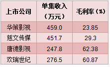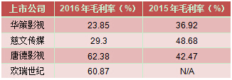 但另一方面,华策影视以及慈文传媒在毛利率方面有着差强人意的表现。毛利率数据显示,2016年华策影视以及慈文传媒的毛利率分别下跌13个百分点以及19个百分点。但是“小而美”的制作型企业唐德影视以及欢瑞世纪的毛利率均呈现10个百分点以上的上升。这也验证了一句话,头部企业的成长性正在逐渐削弱。