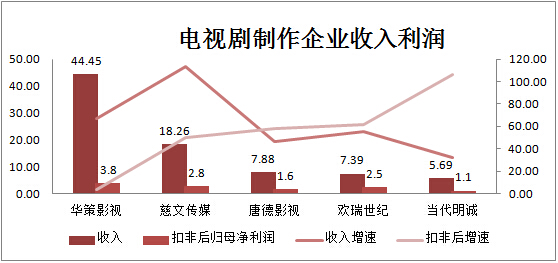 华策影视的收入及扣非后归属于母公司利润遥遥领先,2016年分别实现44.45亿元的收入以及3.8亿元的扣非后净利润。按照比例推算,慈文传媒以70%的电视剧收入占比、18.26亿元的收入规模排列第二。欢瑞世纪以7.39亿元排列第三,唐德影视以50%的电视剧收入占比、7.88亿元的收入暂列第四。