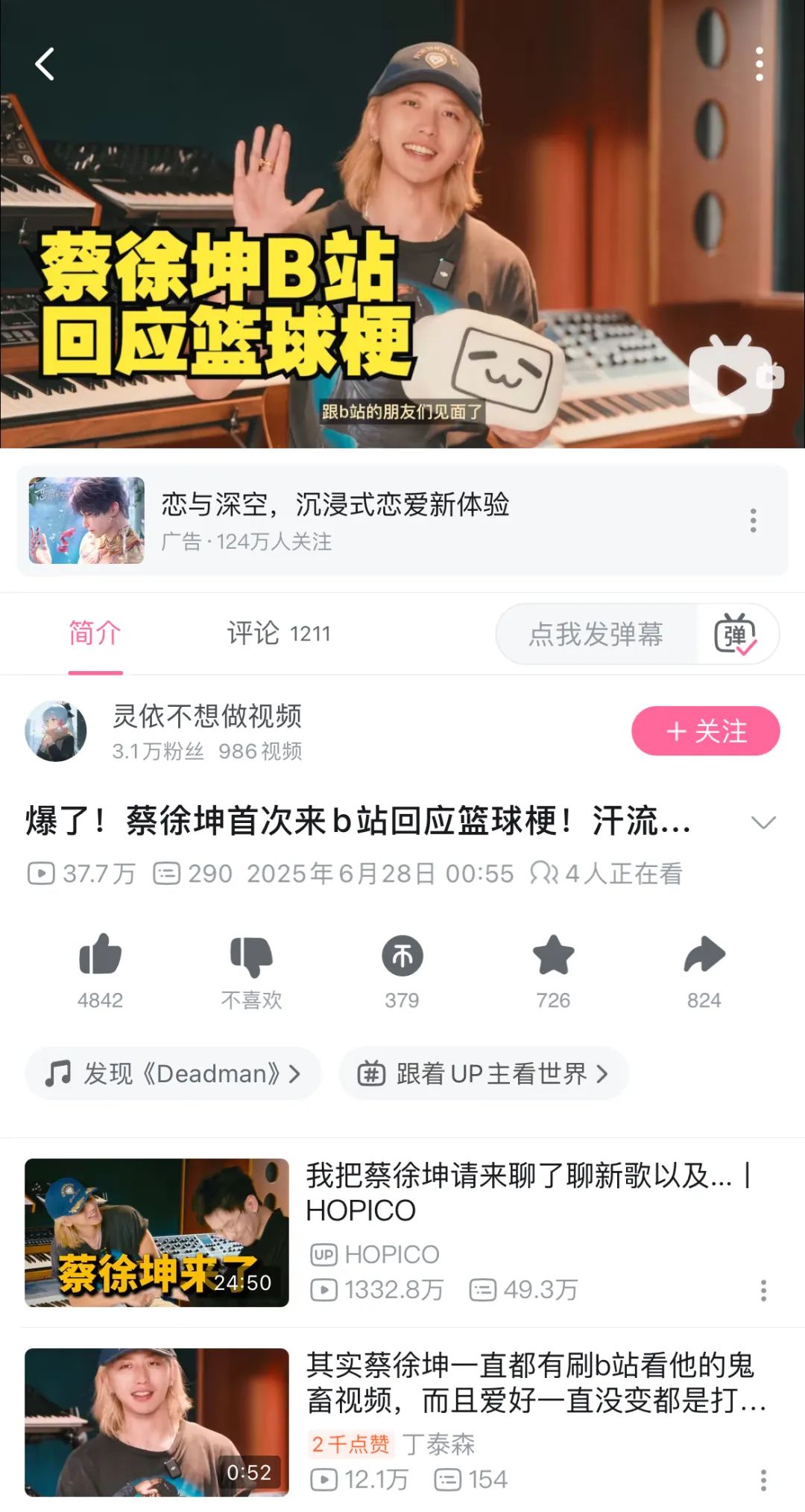 “归来仍是顶流”、“唯一真神”、“1321万播放打卡”、“最少都是几千人同时在线”……自6月27日下午5点半发布以来,B站音乐区头部UP主HOPICO对蔡徐坤的专访、也是蔡徐坤新歌《Deadman》发布后首次接受专访,已经获得1344万播放与近50万条弹幕,拿下B站全站排行榜最高第一名。