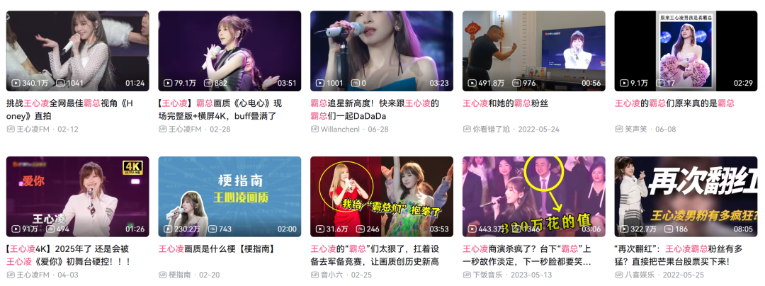 王心凌与她的霸总粉丝名声在外,B站在其中也发挥了不小作用。作为视频社区,B站早是国内第一大直拍集散地,王心凌的霸总粉丝们便是在B站比拼直拍画质,最终在全网发散出了“王心凌粉丝开启军备竞赛”的话题。