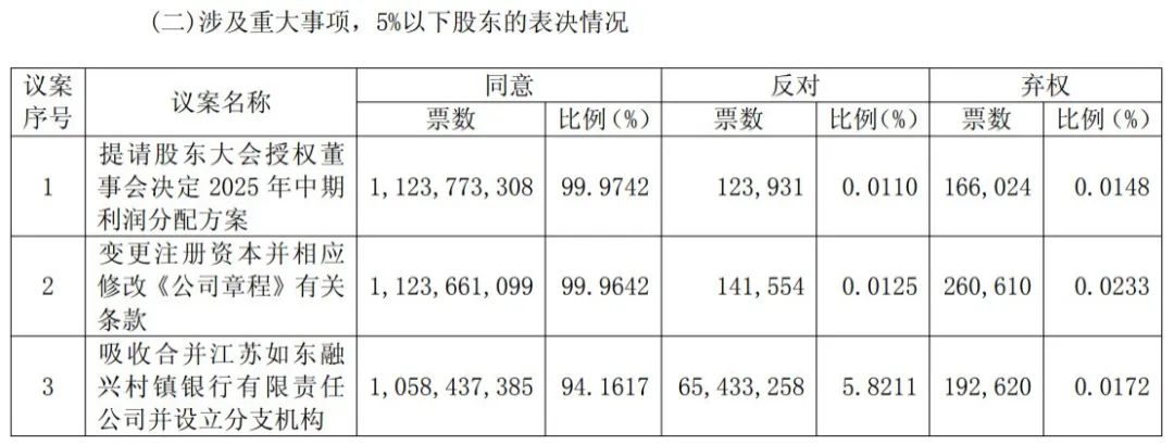会议表决通过此前6月中旬公开披露的三项议案:一是提请股东大会授权董事会决定2025年中期利润分配方案,二是变更注册资本,三是吸收合并江苏如东融兴村镇银行并设立苏州科技支行。