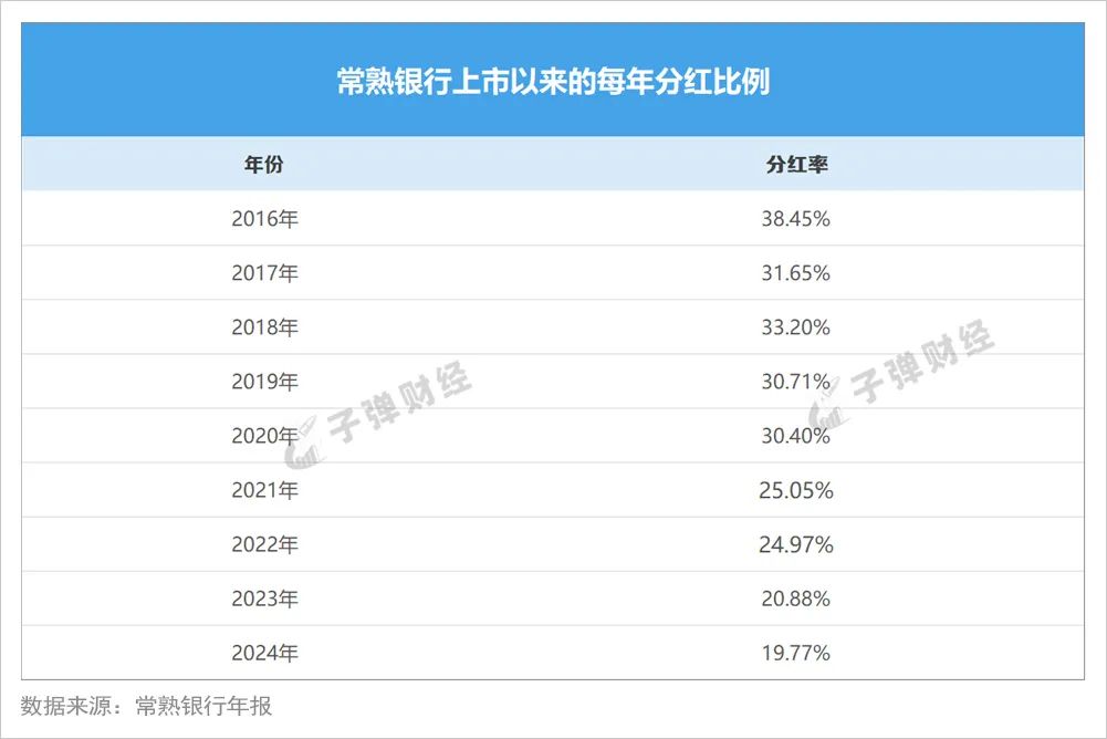 数据显示,该行分红比例从2016年的38.45%降至2024年的19.77%。2019-2024年,该行分红比例连续六年持续下降,分别为30.71%、30.40%、25.05%、24.97%、20.88%、19.77%。