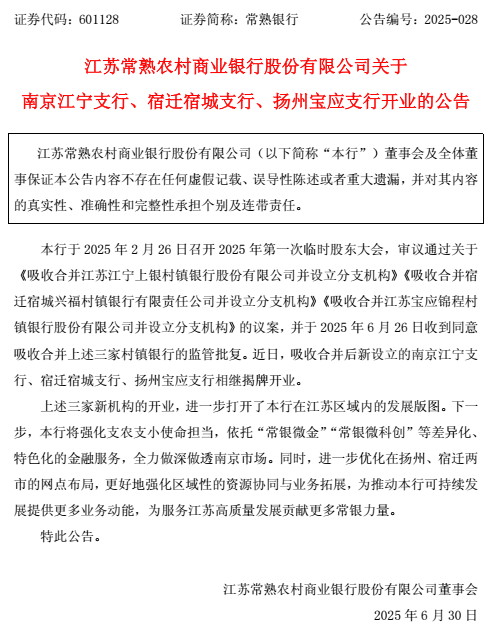 第三,3家村镇银行“村改支”最新获批并完成支行开业。6月30日,常熟银行公告披露,于6月26日已收到监管部门批复,同意吸收合并宿迁、宝应、江宁三家村镇银行。