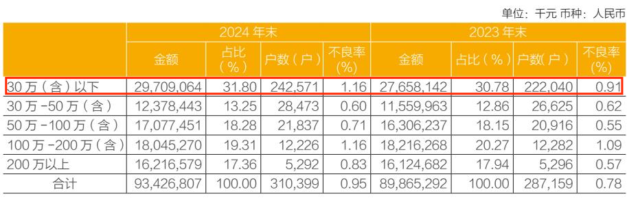 2024年末,该行100万元以下贷款客户占比94.06%,个人经营性贷款户数占比55.33%。其中,个人经营性贷款的五档贷款金额不良率均有所上升,上涨幅度最高的是30万(含)以下贷款,不良率从0.91%提升至1.16%。
