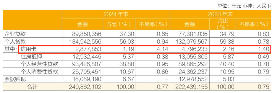 此外,按照产品类别来看,该行信用卡业务2024年不良率增长最高,从2023年的1.4%抬升至2024年的4.14%。