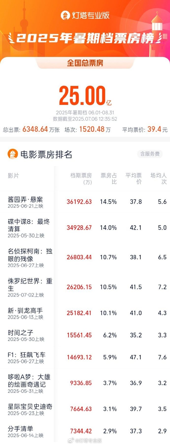 据灯塔专业版,截至7月6日12时35分,2025年暑期档(6月-8月)总票房(含预售)突破25亿!《酱园弄·悬案》《碟中谍8:最终清算》《名侦探柯南:独眼的残像》暂列前三。