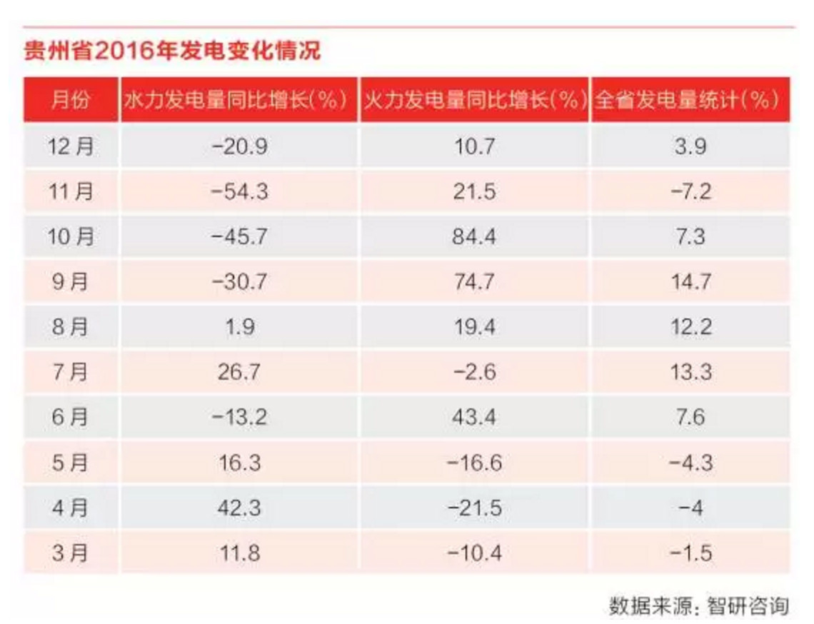 对比2016年水电发电量和火电发电量很容易看出端倪。10月和11月贵州水电发电量大幅下降,分别同比下降了45.7%和54.3%,而火力发电则在9月份和10月份大幅增加,分别同比增加了74.7%和84.4%。