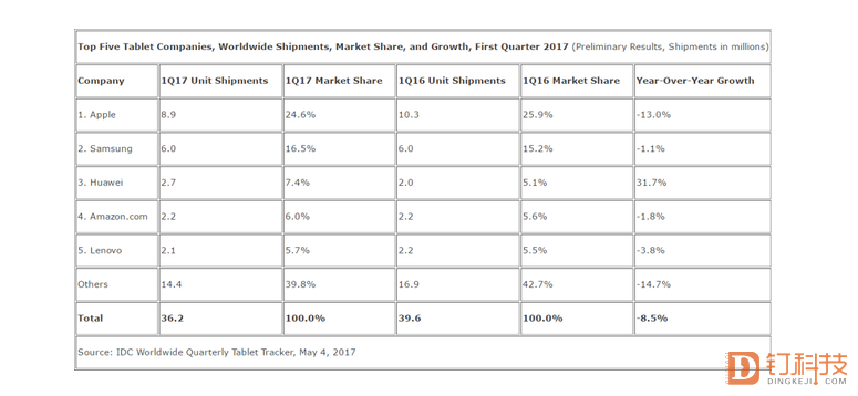 华为消费者BG部门最近的日子并不好过,P10的“闪存门”事件让华为手机遭遇了少有的挫折。但好在华为的业务众多,手机业务的短暂挫折并没有影响华为整体的发展。IDC最新的数据显示,在第一季度,华为平板电脑出货量反超了亚马逊和联想,跻身全球前三,是前五品牌中唯一正增长的品牌。