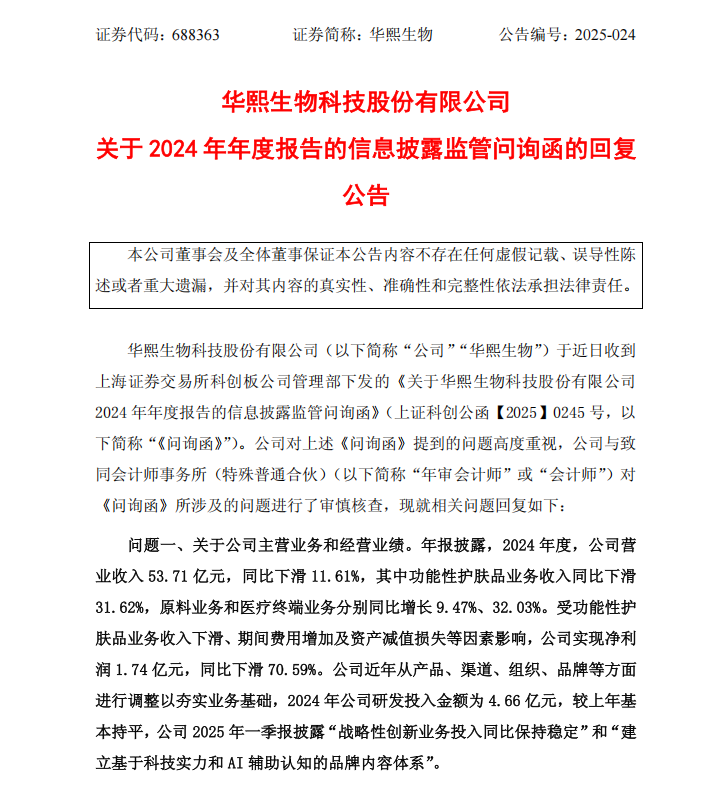 在被上交所问询之后,华熙生物坦诚地披露了功能性护肤品业务放缓的更多细节。