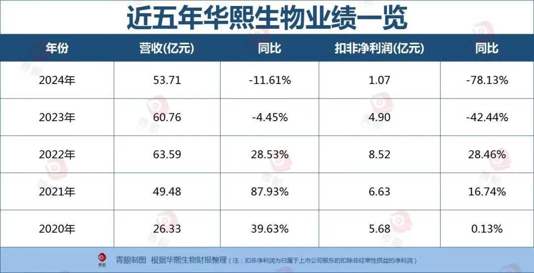 据公开财报显示,2020—2022年,华熙生物营收增速为39.63%、87.93%、28.53%,同期营收分别为26.33亿元、49.48亿元、63.59亿元。但自2023年开始,随着功能性护肤品业务的失速,华熙生物整体业绩也开始出现下滑。至今,已连续两年业绩承压。