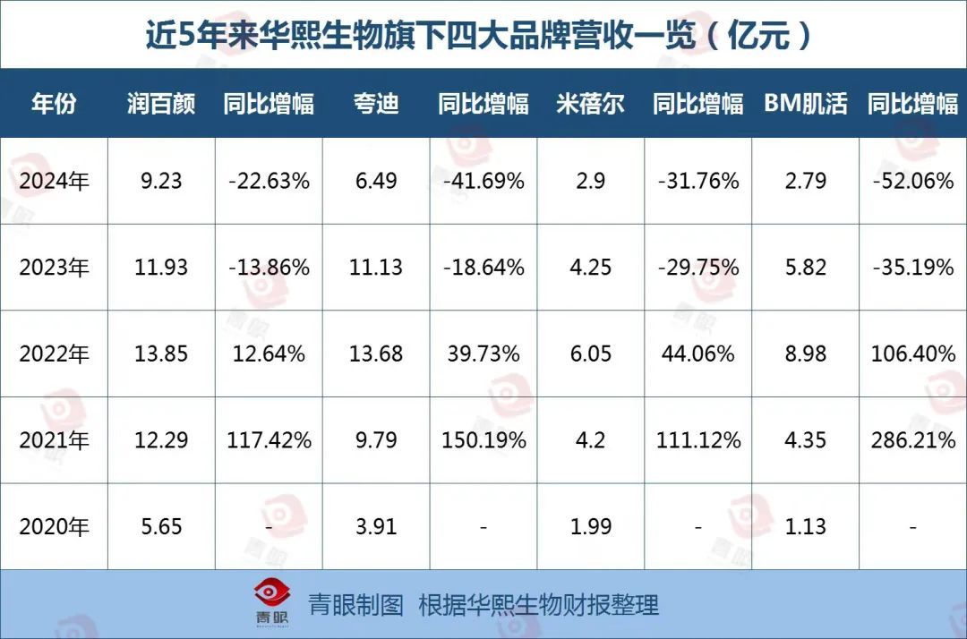 据华熙生物《回复公告》披露,2023年,润百颜、夸迪、米蓓尔、BM肌活营收分别为11.93亿元、11.13亿元、4.25亿元、5.82亿元,分别同比下滑为13.86%、18.64%、29.75%、35.19%;2024年润百颜、夸迪、米蓓尔、BM肌活营收分别为9.23亿元、6.49亿元、2.9亿元、2.79亿元,分别同比下滑为22.63%、41.69%、31.76%、52.06%。