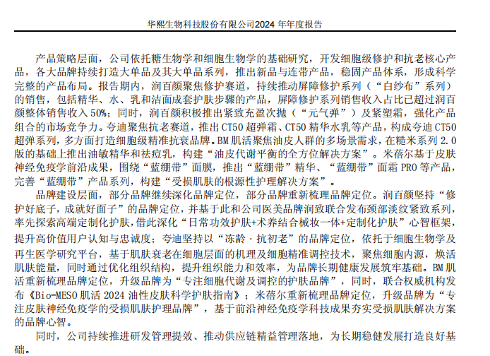 据华熙生物发布的2024年年度报告(修订版)显示,润百颜坚持“修护好底子,成就好面子”的品牌定位,深化“日常功效护肤+术养结合械妆一体+定制化护肤”心智框架;夸迪坚持以“冻龄 抗初老”的品牌定位,同时通过优化组织结构以提升组织能力和效率;BM肌活重新梳理品牌定位,升级品牌为“专注细胞代谢及调控的护肤品牌”;米蓓尔重新梳理品牌定位,升级品牌为“专注皮肤神经免疫学的受损肌肤护理品牌”,基于前沿神经免疫学科技成果夯实受损肌肤解决方案的品牌心智。
