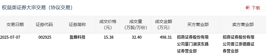 7月7日,盈趣科技大宗交易成交32.4万股,成交额498.31万元,占当日总成交额的4.25%,成交价15.38元,较市场收盘价16.87元折价8.83%。