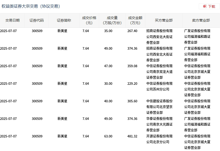 7月7日,新美星大宗交易成交313万股,成交额2391.32万元,占当日总成交额的34.6%,成交价7.64元,较市场收盘价8.52元折价10.33%。